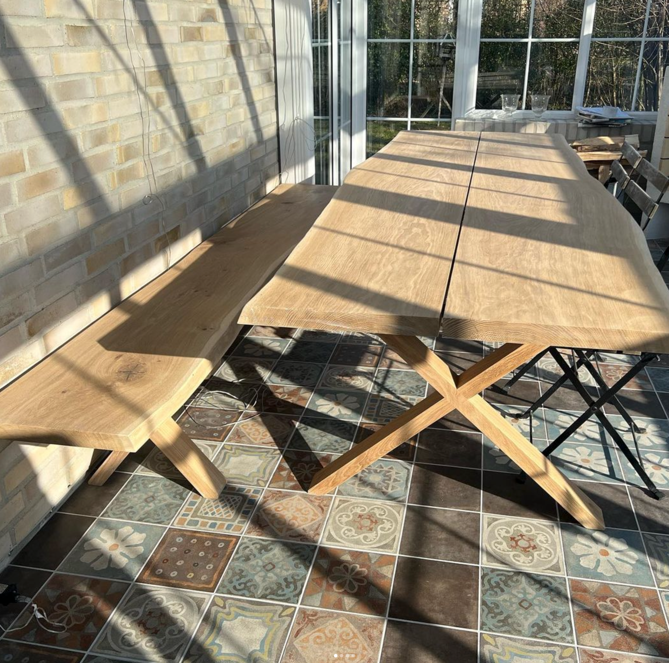 40mm tyk ovntør eg, hele planker som ikke er lamineret eller sammensat af stave. I langt de fleste borde kommer alle planker fra samme stamme.